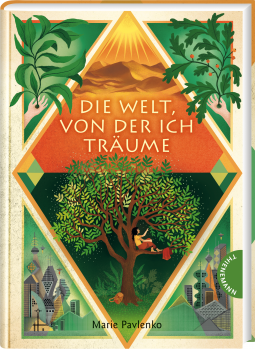 Das Cover von „die Welt, von der ich träume" von Marie Pavlenko, ist toll ausgearbeitet und passt sehr gut zum Inhalt der Geschichte. Im Hintergrund sieht man die moderne Stadt und Hände, die Pflanzen halten. In der Mitte sieht man ein zweigeteiltes Rhombus. Im oberen Teil erkennt man die trockene Wüste, im unteren kann man den grünen Wald erkennen. Die satten Farben gefallen mir sehr gut.